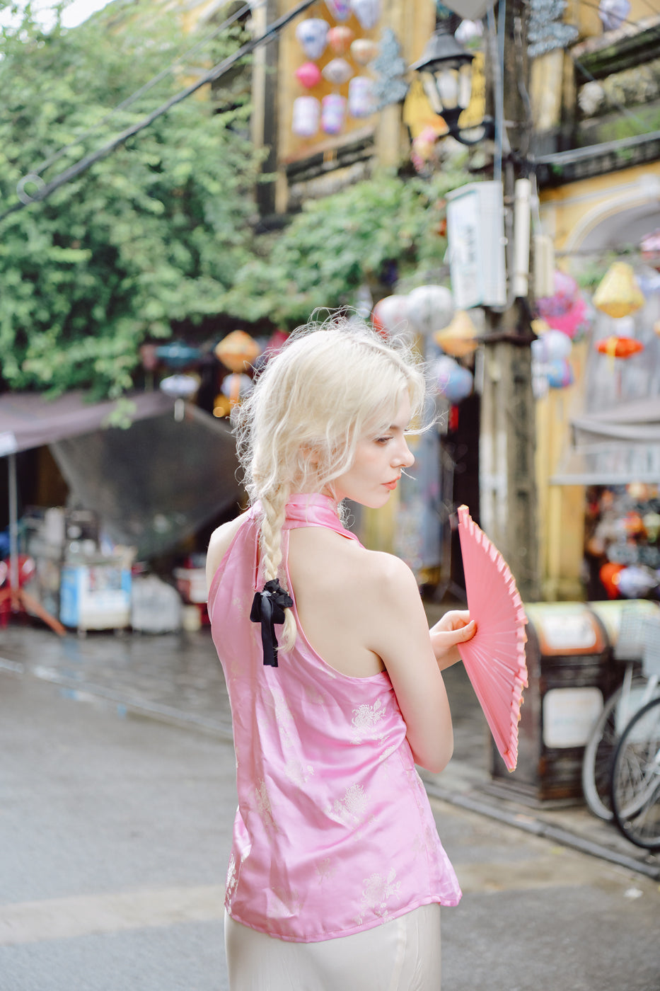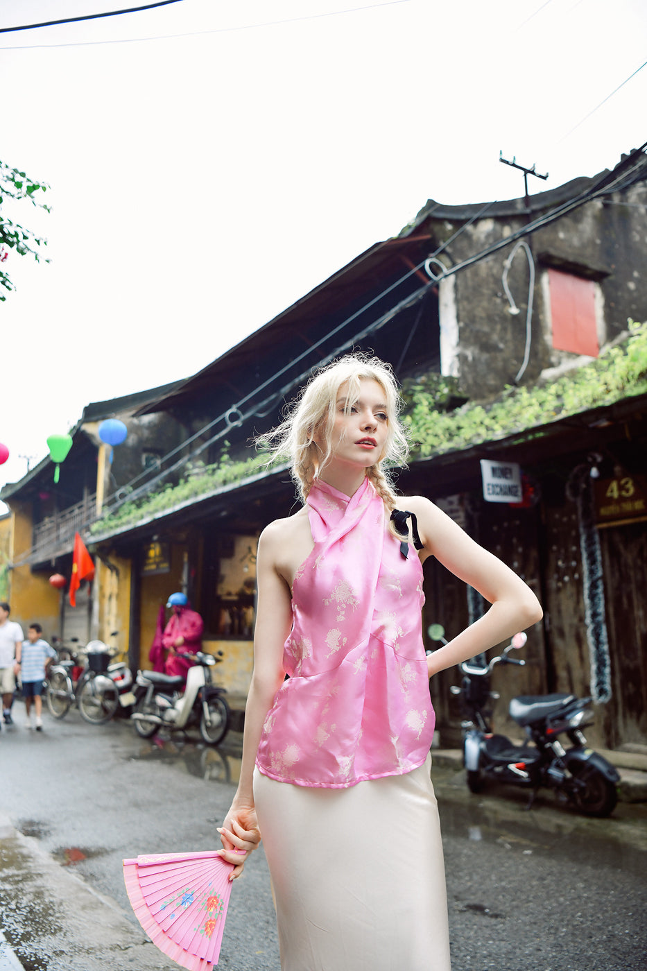 This halter top is crafted from Vietnamese heritage mulberry silk, designed to frame the neckline and shoulders with quiet elegance. The halter silhouette creates a clean, elongated line, allowing the silk to fall fluidly against the body.