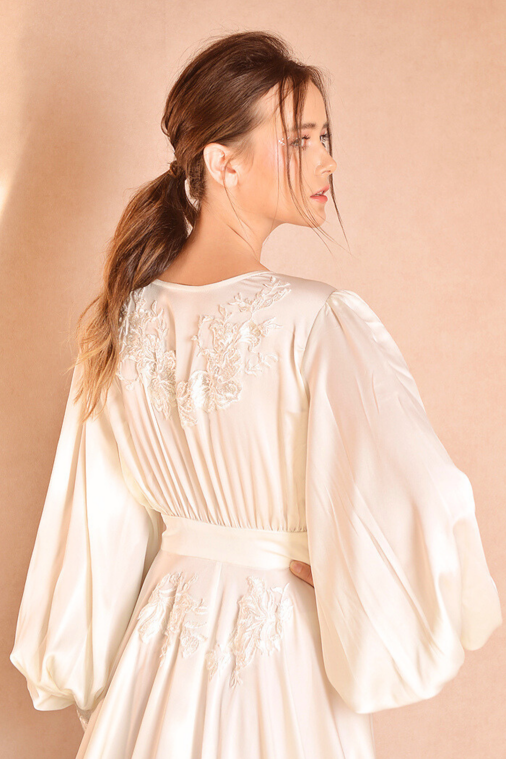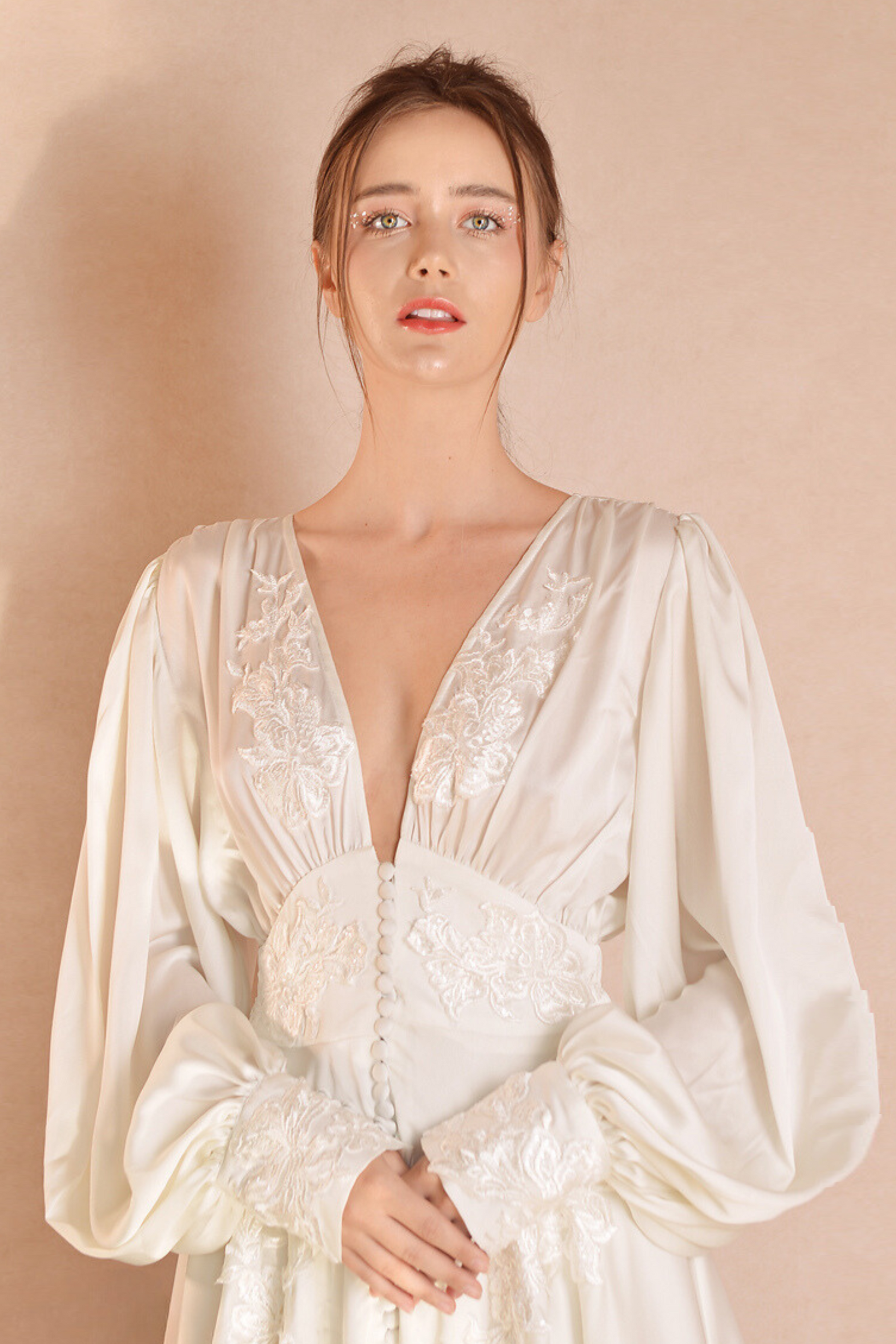 The ANASTASIA Vintage Embroidered Silk Wedding Gown features a plunging V-neckline and intricate floral embroidery, this gown exudes romance and sophistication. Flowing sleeves shows off her vintage look, while the fitted waist and cascading skirt create a graceful silhouette that flatters every movement. Delicate button details along the front add a classic element.