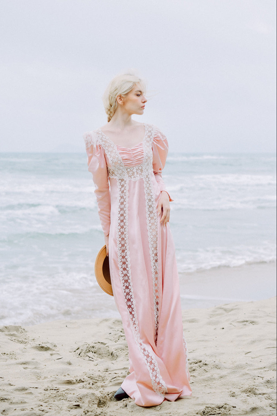 Corinne is a floor-length silk dress, designed in the spirit of a true Romantic. Softly puffed sleeves, delicate lace detailing, and a flowing silhouette come together to create a dress that feels timeless, intimate, and deeply feminine.