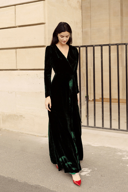 The HALEY Velvet Evening Gown brings luxury to any formal event like a wedding guest dress. This full-length dress is crafted from lush velvet, offering a figure-flattering silhouette with a comfortable, flexible fit. The wrap design and long sleeves add sophistication, while the deep neckline makes it perfect for evenings out or special occasions, such as a wedding guest dress.