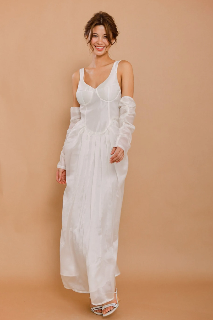 The VERONICA Habotai Silk Corset Wedding Dress is crafted from the finest Habotai silk, lined with silk and comes with Habotai gloves, offering a luxurious and smooth feel for your special day. The corseted bodice with gloves and gathered pleats at the waist provides a flattering silhouette, while the fitted design exudes elegance. The dress features subtle ruching at the back, adding a touch of sophistication to its minimalist style. With sheer, detachable sleeves for a contemporary twist, this gown is perfect for the fashion-forward bride seeking a unique look for her wedding.