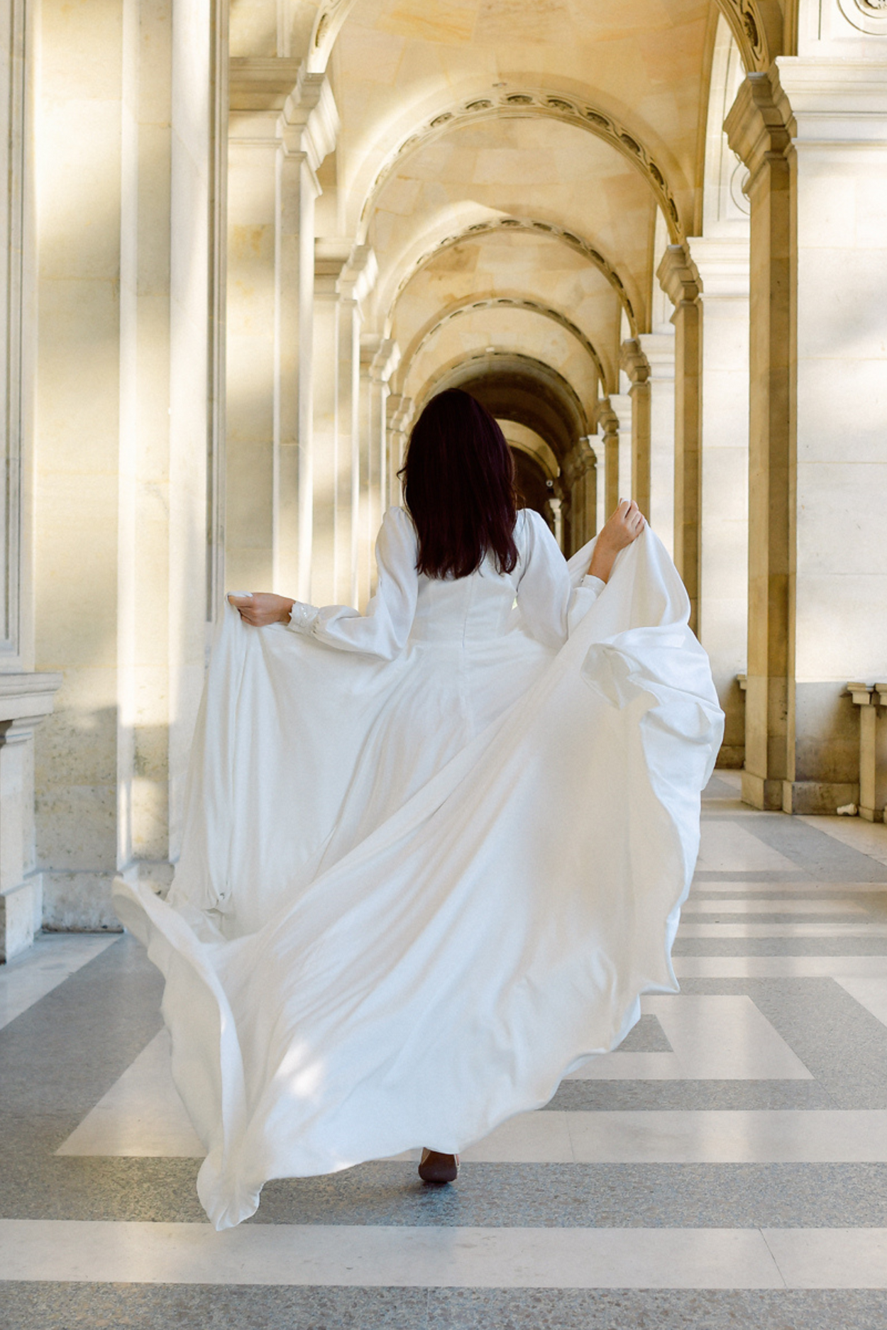 The elegant long sleeves, adorned with delicate embroidery and subtle ruffles, give her a charming vintage feel. Her full, flowing skirt sways with every step, creating a look that is both graceful and breathtaking.