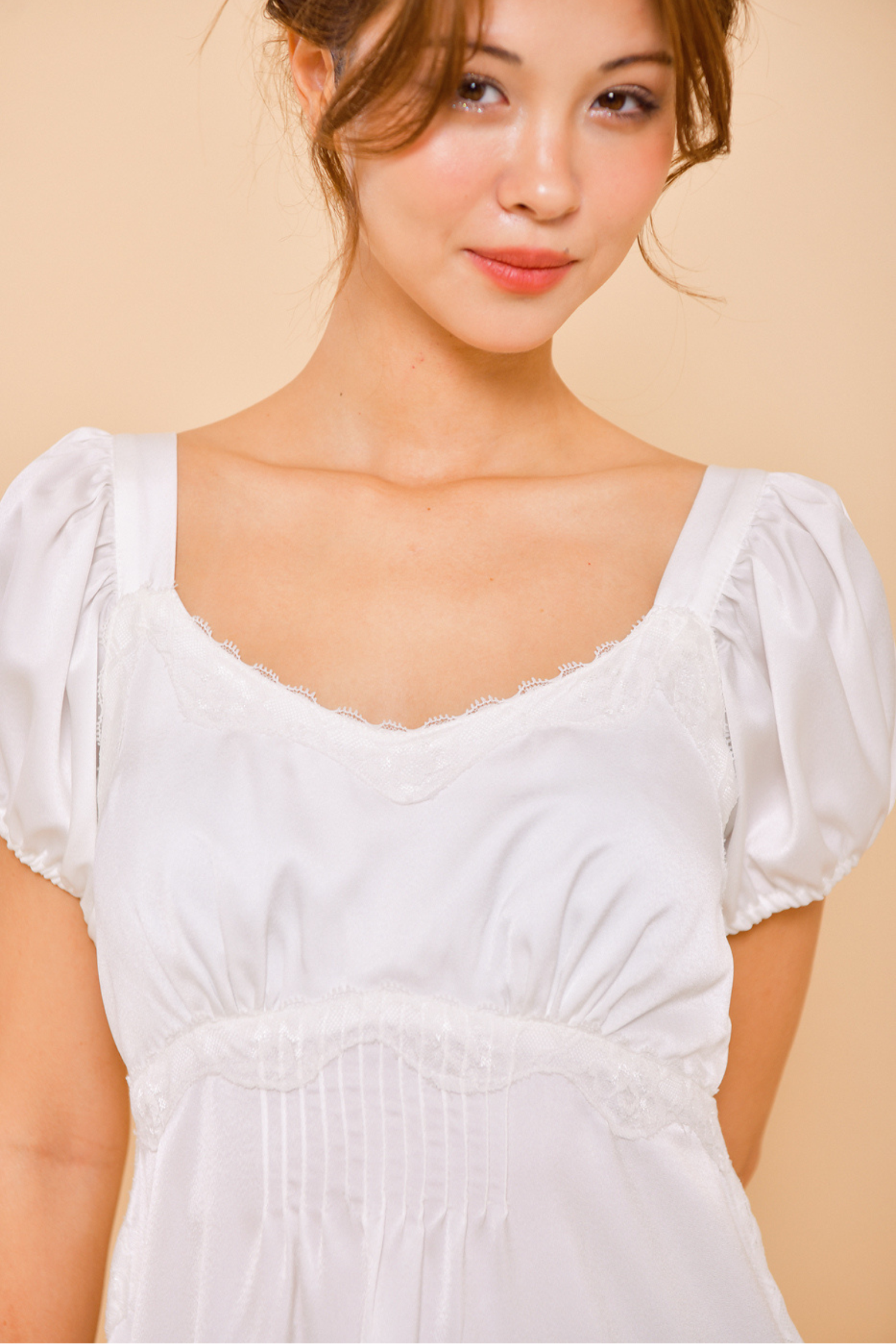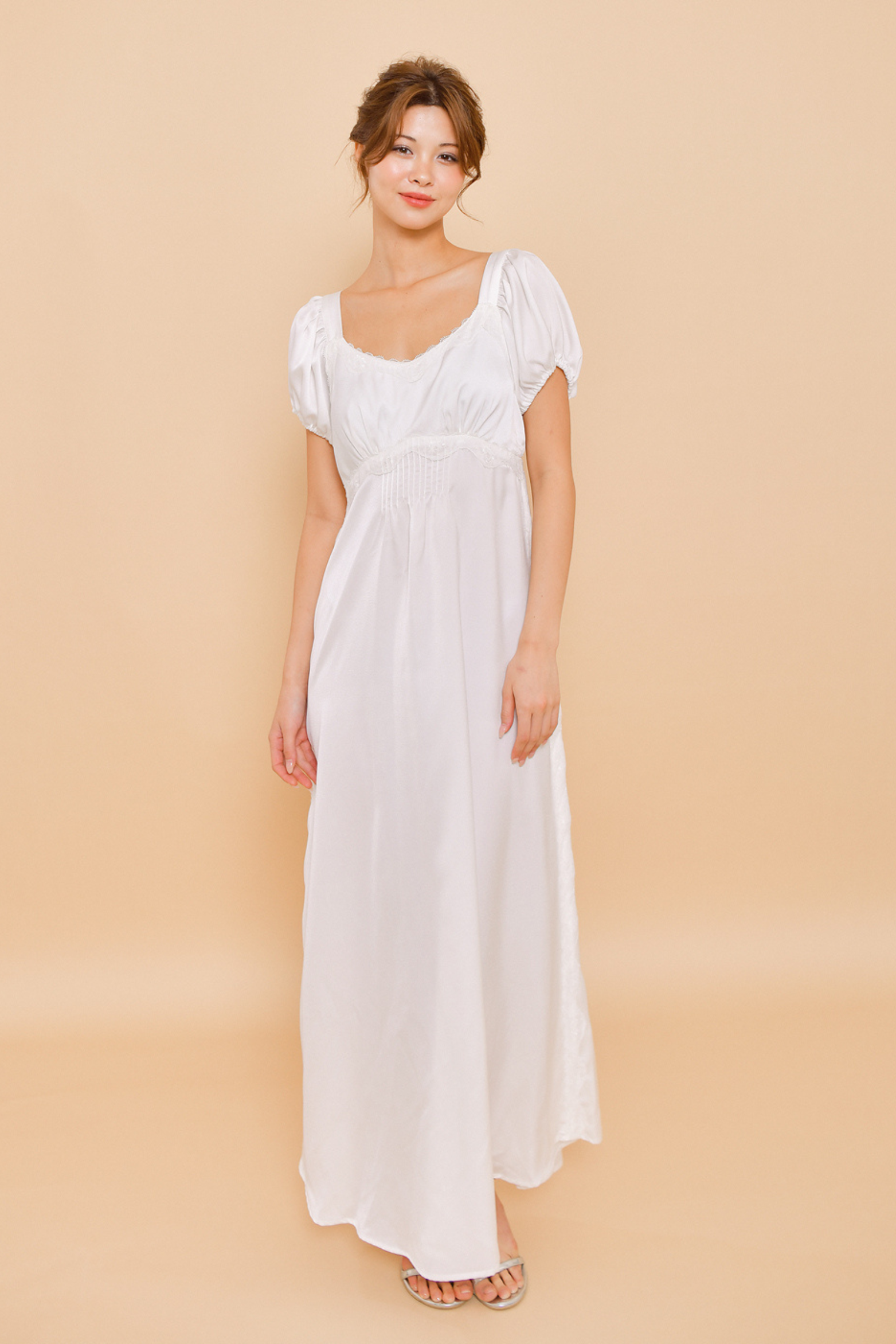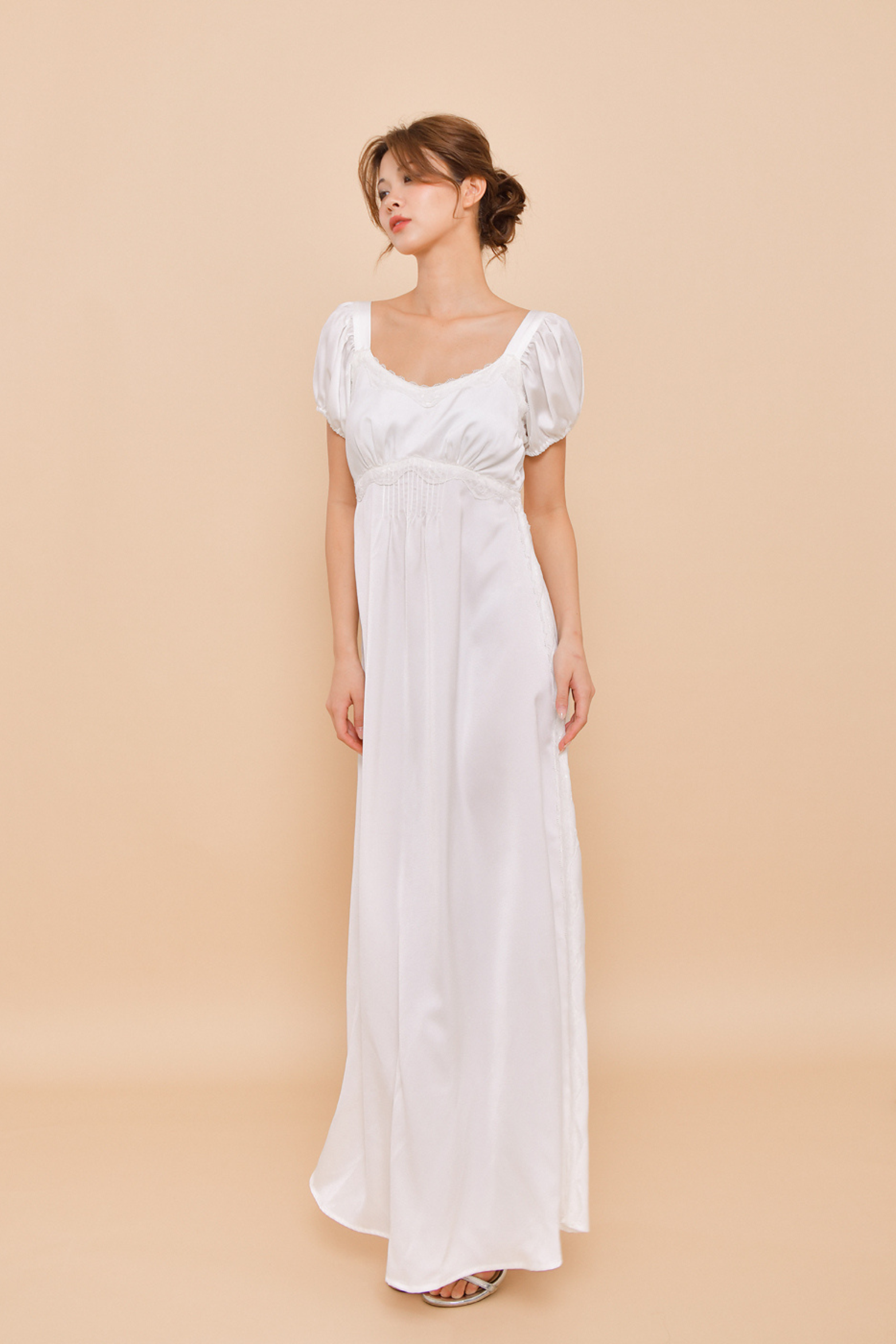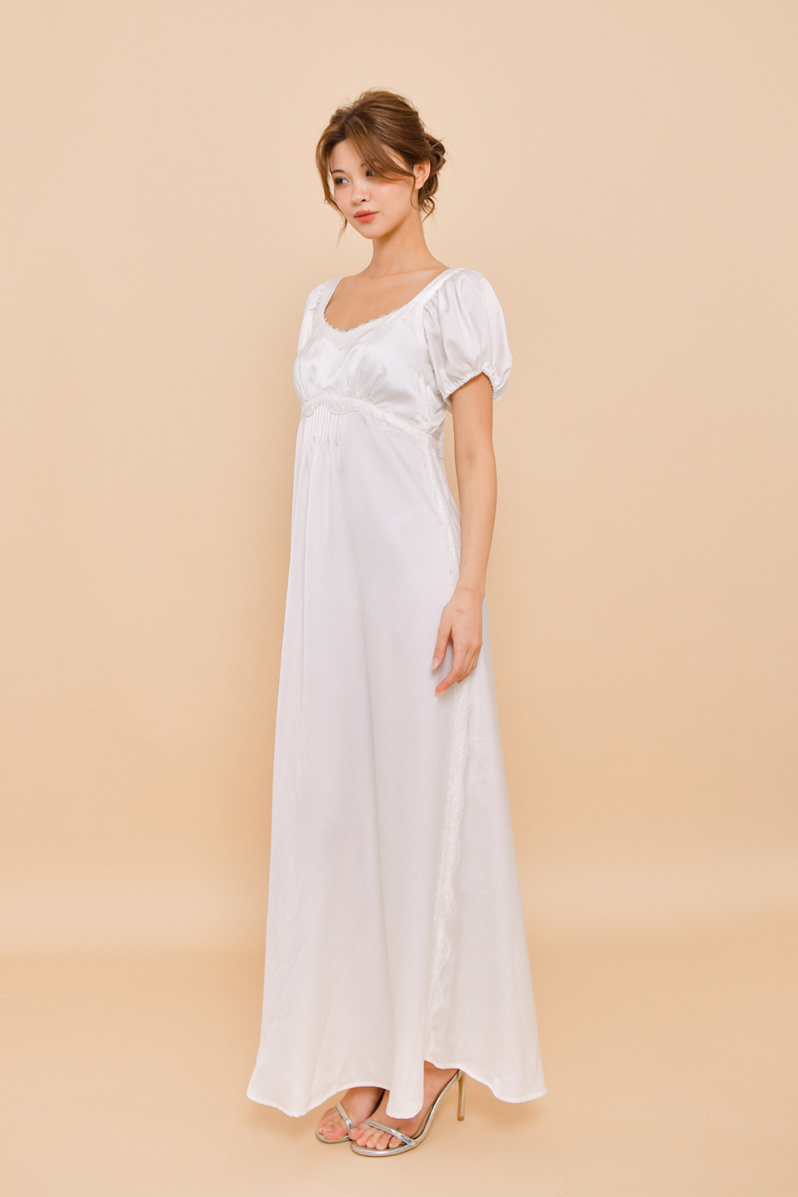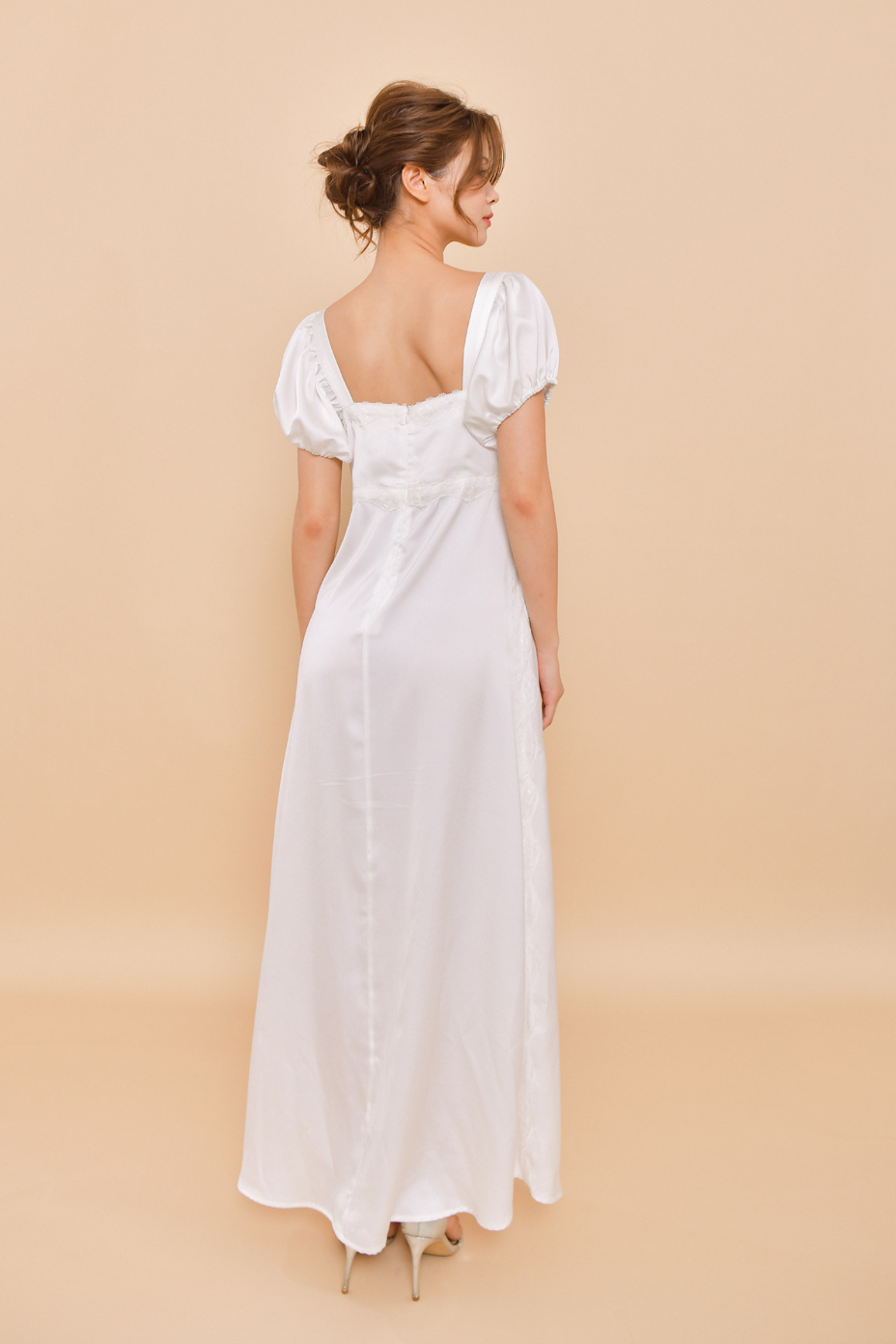 The ROBYN Empire Waist Silk Vintage Wedding Dress is truly a timeless piece designed for the bride who cherishes vintage-inspired details. This luxurious gown is crafted from pure silk, offering a luminous finish, and features delicate lace accents that add charm and sophistication. The empire waist design, paired with soft puff sleeves and a gentle scoop neckline, creates a silhouette that’s flattering and romantic.