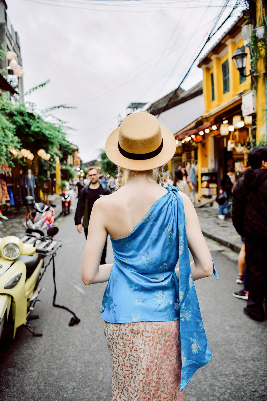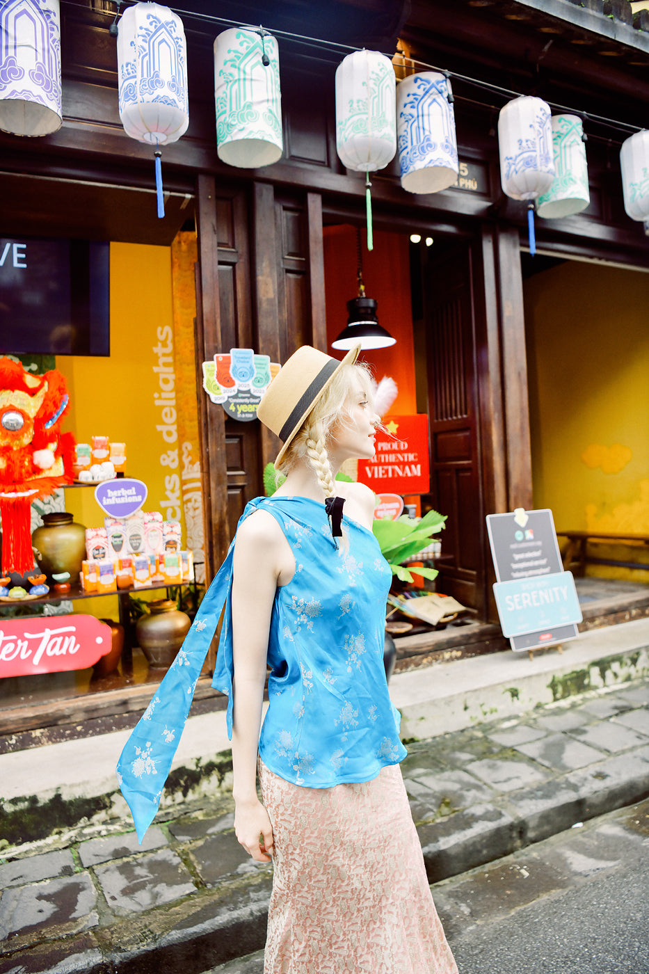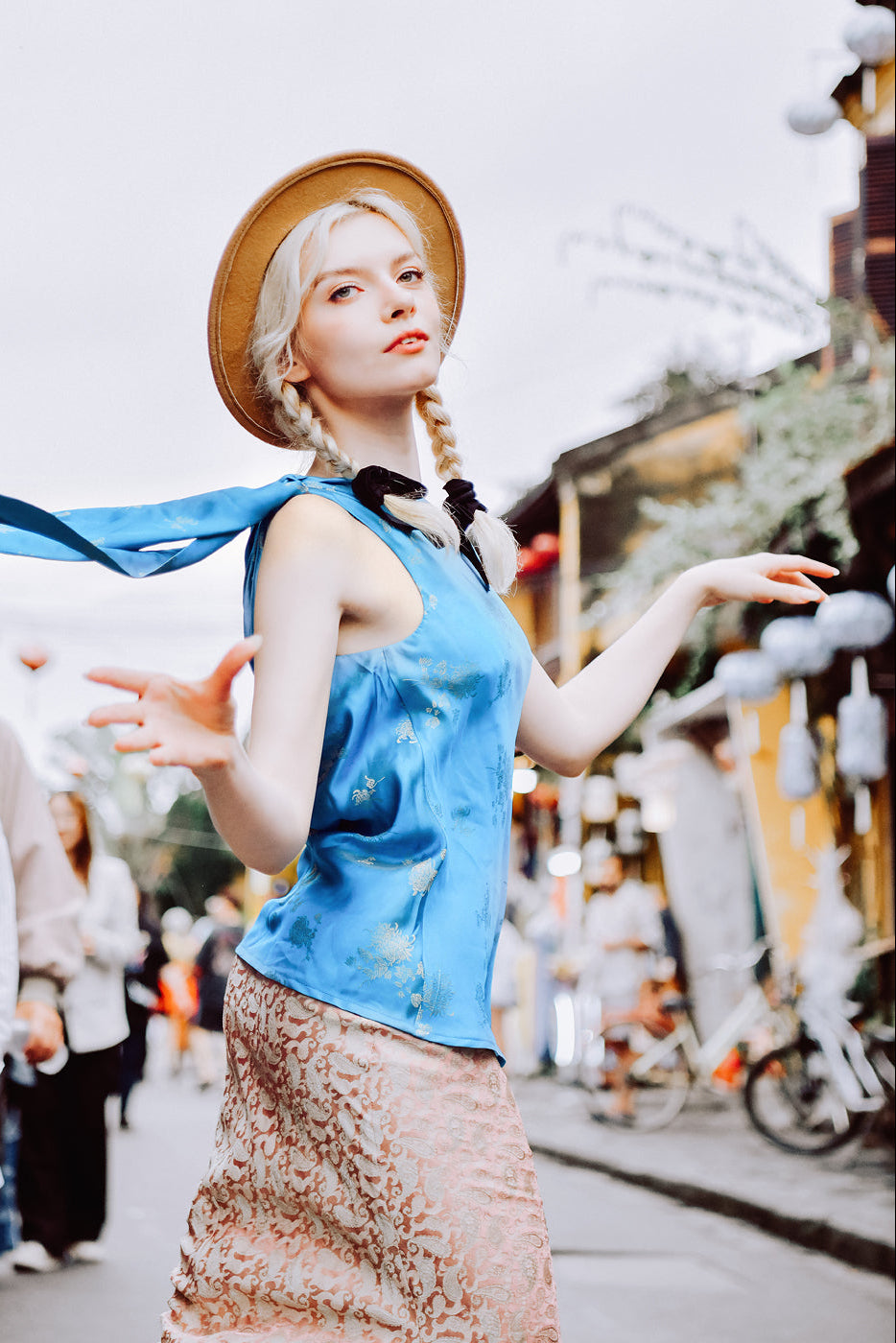 Rendered in a rich blue, the fabric’s natural sheen enhances the clean lines of the silhouette while remaining understated and refined. The asymmetry creates a quiet sense of modernity, balanced by the softness of the silk.